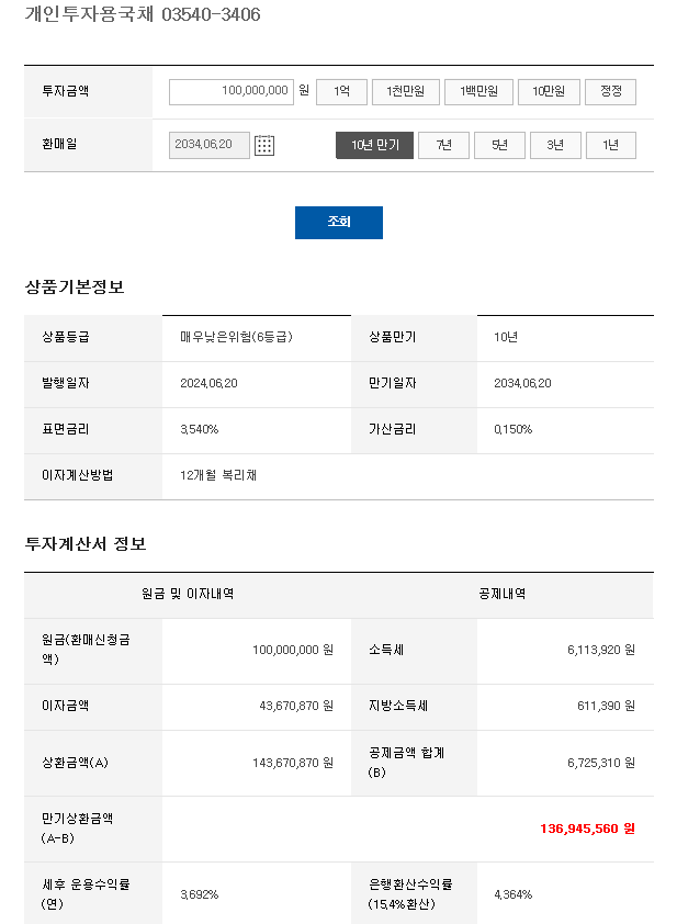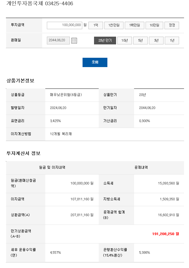 2종류의 국채 만기 수익률은 10년물 44%(세후 37%), 20년물 108%(세후 91%)입니다. 가산금리나 연 복리 수준이 높아 장기저축이 가능하다면 목돈을 만들 수 있는 특징이 잇습니다. 20년물의 경우 1억의 원금이 보유할 경우 20년 뒤에는 1억 9천1백여만 원의 돈이 모입니다. 거의 원금 수준의 금액이 들어오는 셈입니다. 그리고 만기 시 15.4% 별도 세율(지방소득세포함)로 분리과세하기 때문에 이자소득이 종합소득에 합산되지도 않는다는 장점도 있습니다.