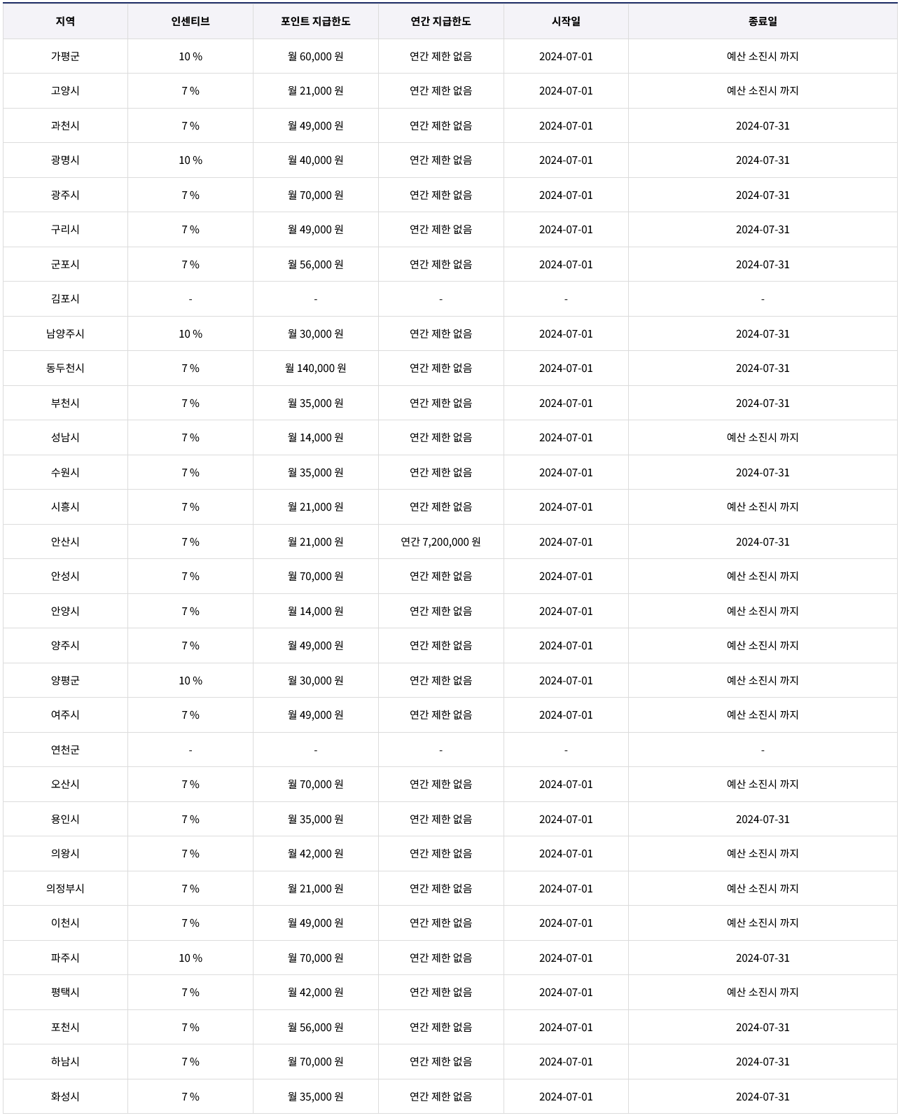 ▶7월 경기지역화폐 지역별 인센티브 현황