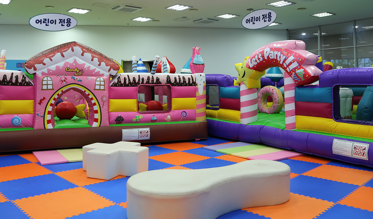 1층으로 올라가게 되시면 우리 아이들이 제일 좋아할 만한 장소가 나옵니다. 신나는 놀이마당/세상, 에어바운스 등 다양한 놀이시설을 보유하고 있습니다.