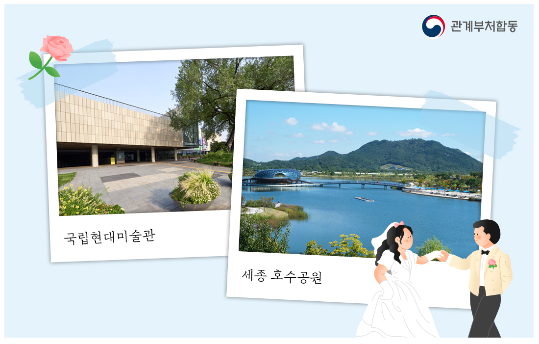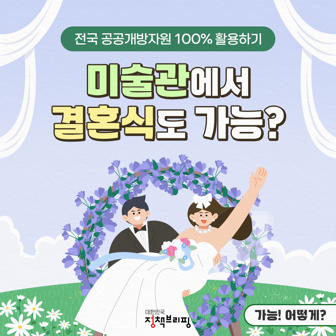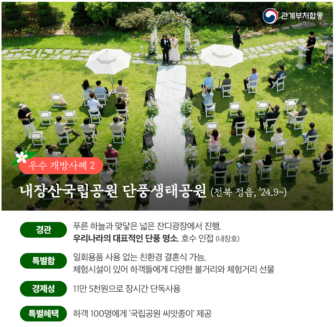 예비부부들이 개성을 담은 특별한 결혼식을 올릴 수 있도록 지자체, 공공기관 등이 보유한 시설을 맞춤형 예식공간으로 제공합니다. 국립중앙박물관, 국립현대미술관 등 국립시설 5개소, 국립공원 야외공원 10개소, 세종 호수공원 등을 포함한 총 48개 공간을 신규 개방하게 되었습니다.