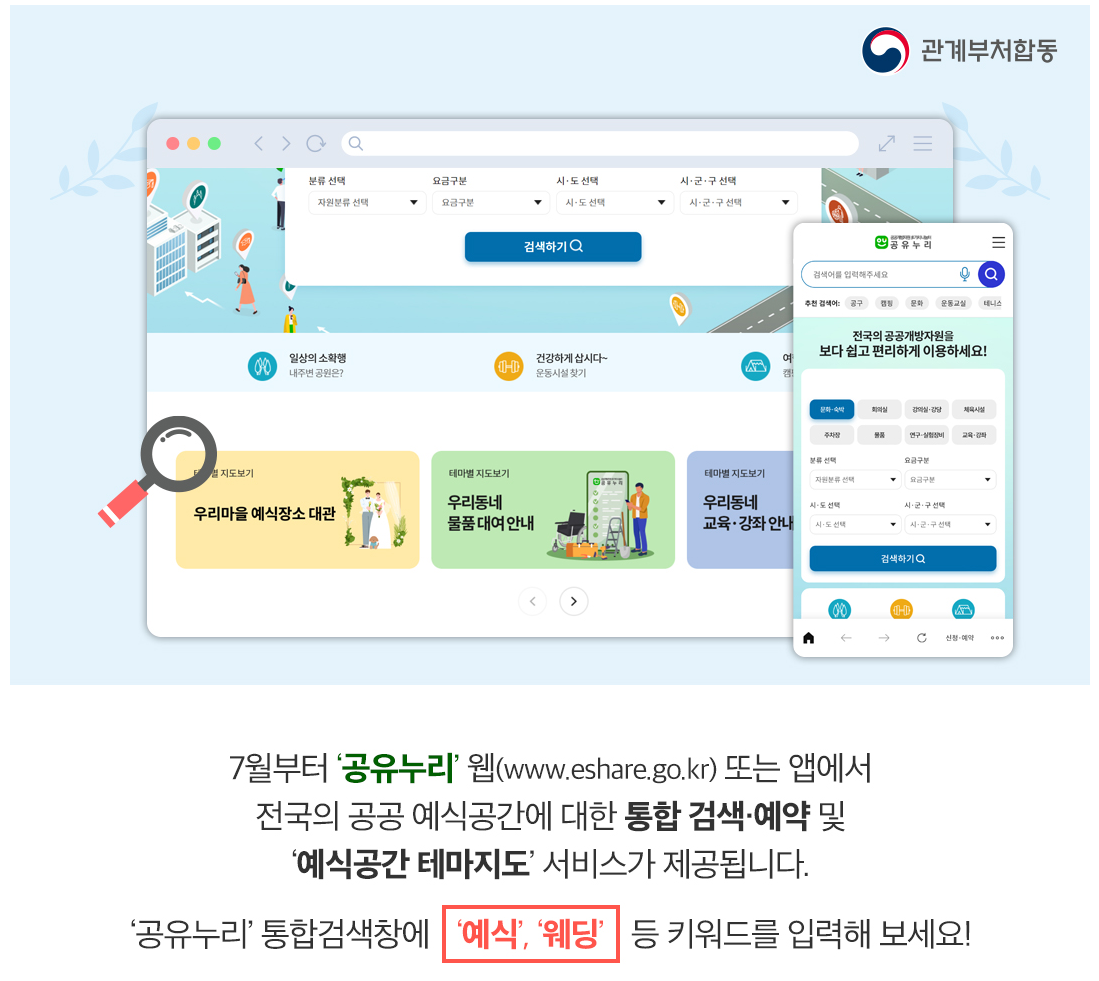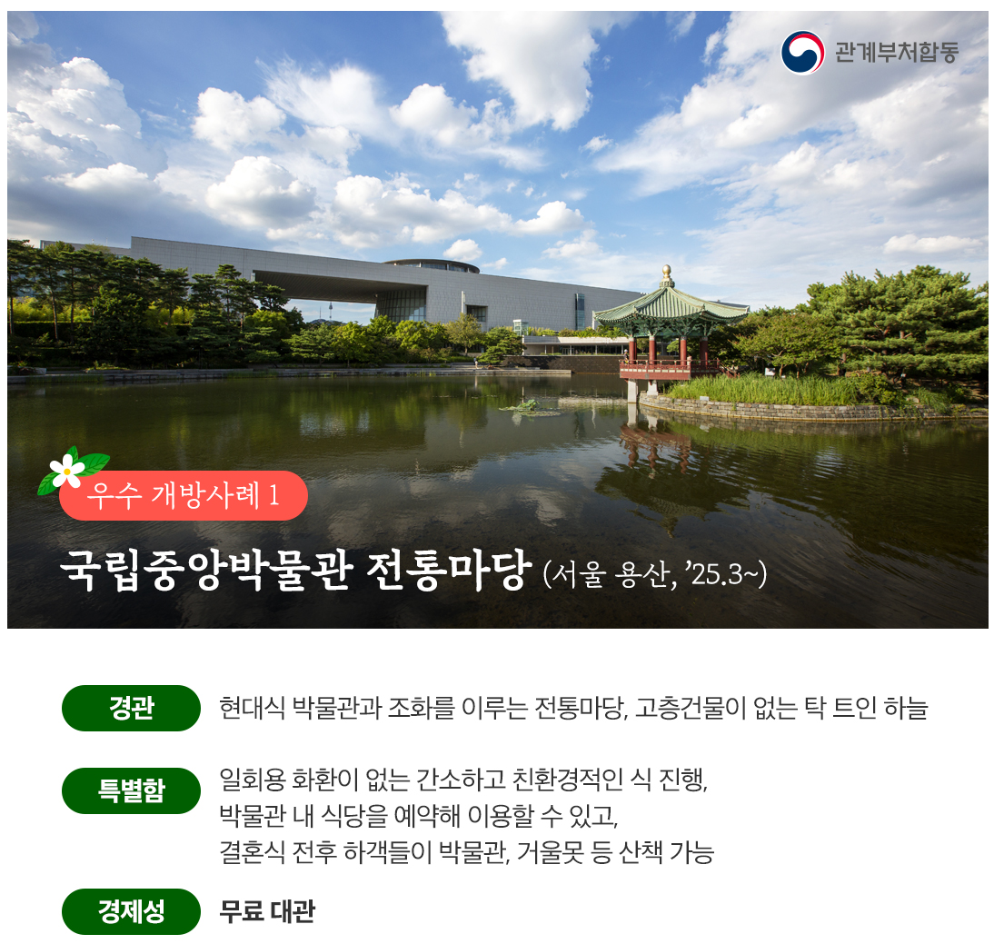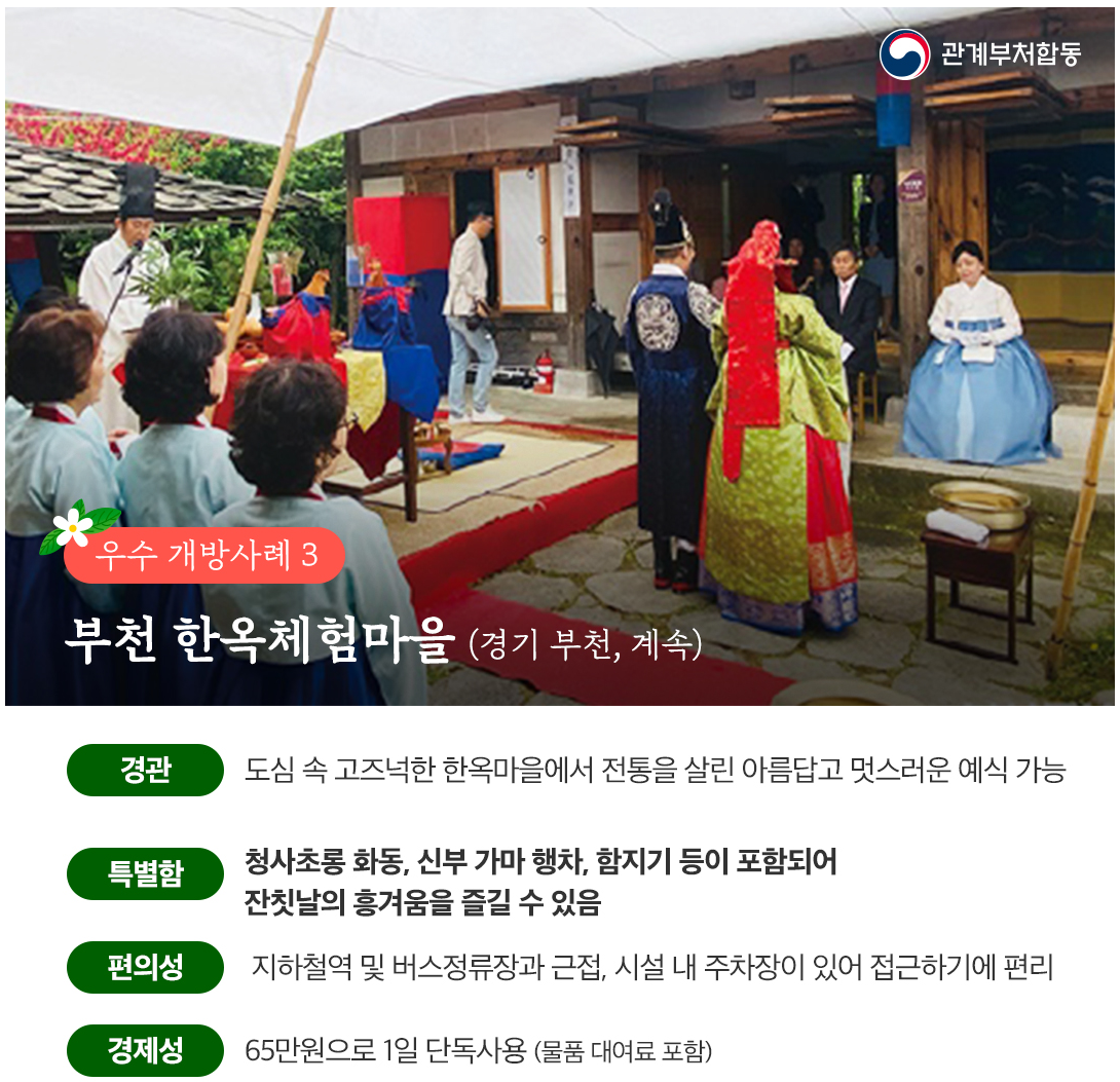 예비부부들이 개성을 담은 특별한 결혼식을 올릴 수 있도록 지자체, 공공기관 등이 보유한 시설을 맞춤형 예식공간으로 제공합니다. 국립중앙박물관, 국립현대미술관 등 국립시설 5개소, 국립공원 야외공원 10개소, 세종 호수공원 등을 포함한 총 48개 공간을 신규 개방하게 되었습니다.