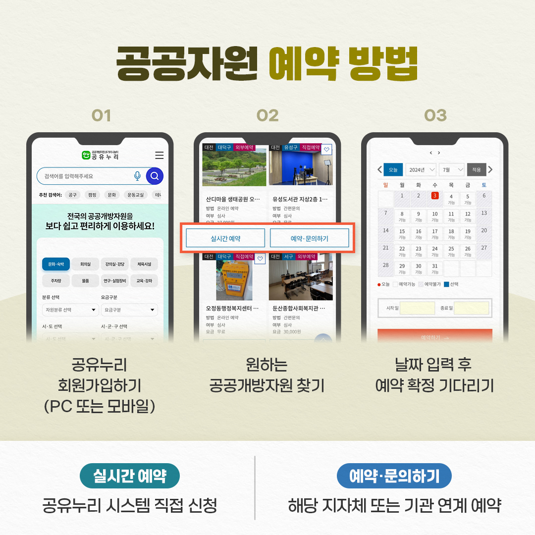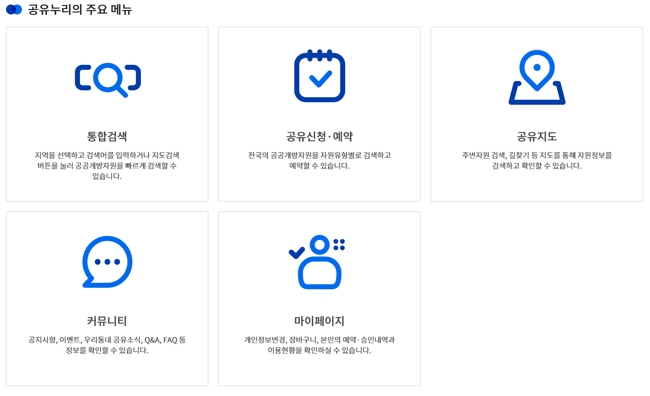 공유누리란 중앙행정기관, 지방자치단체, 공공기관 등 공공 부문에서 국민에게 개방하는 시설, 물품 등 공공개방자원을 국민이 온라인에서 쉬고 편리하게 예약하는 대국민 공공개방자원 공유서비스 포털입니다. 문화/숙박, 회의실, 강의실, 체육시설, 주차장, 연구/실험장비등 다양한 공공 자원 이용이 가능합니다. 이번 포스팅에서는 누리집 활용방법에 대해서 알아보겠습니다.