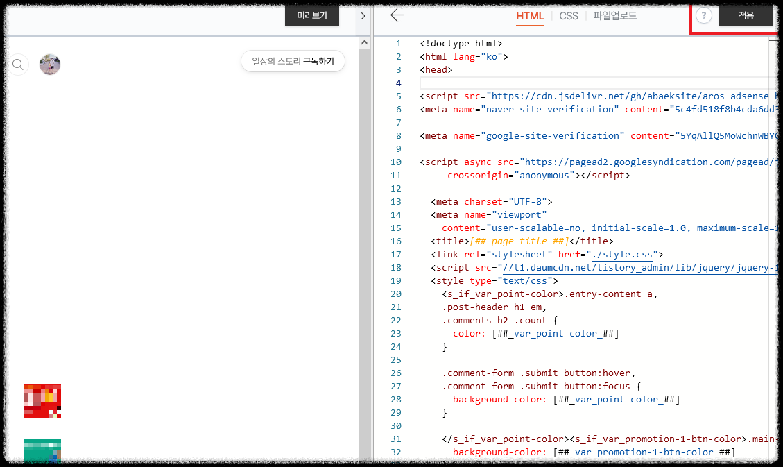 그런 후 적용 버튼을 누르고 나오시면 무효 트래픽 방지코드가 자동으로 적용되고 더 이상의 무효트래픽으로 인한 애드센스 계정 정지에 대한 걱정은 덜 하셔도 될듯합니다.
