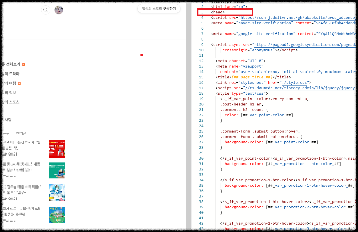 html편집을 누르신 후 아래에 표시한 <head>라는 줄 아래쪽에 칸을 하나 더 만드신 후 위의 방지코드 전체를 붙여 넣기 하시면 됩니다.