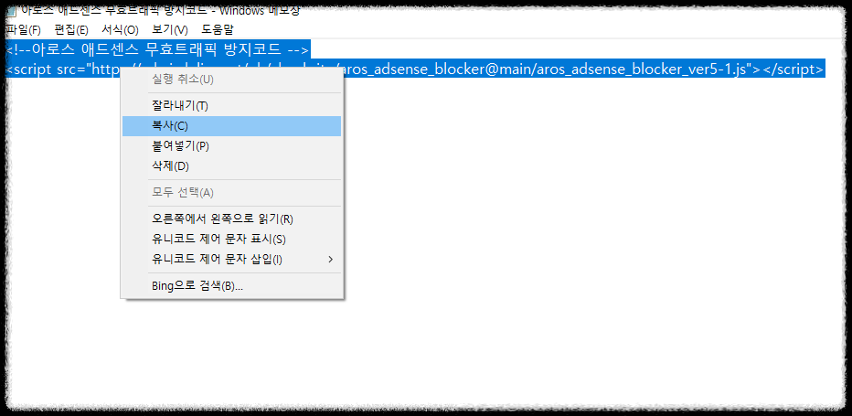 우선 위에서 다운로드하신 무효트래픽 방지코드를 메모장으로 실행시킨 후 전체 항목을 선택하여 복사를 누릅니다.