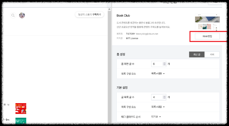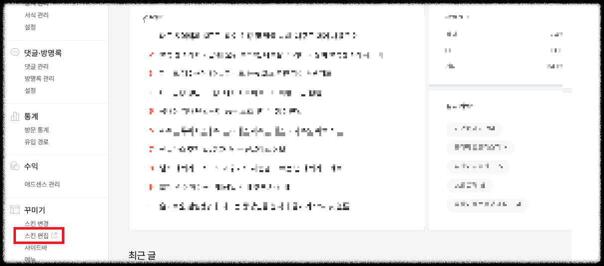 그런 후 내 블로그 관리에 들어가셔서 '스킨편집'항목으로 들어가신 후,