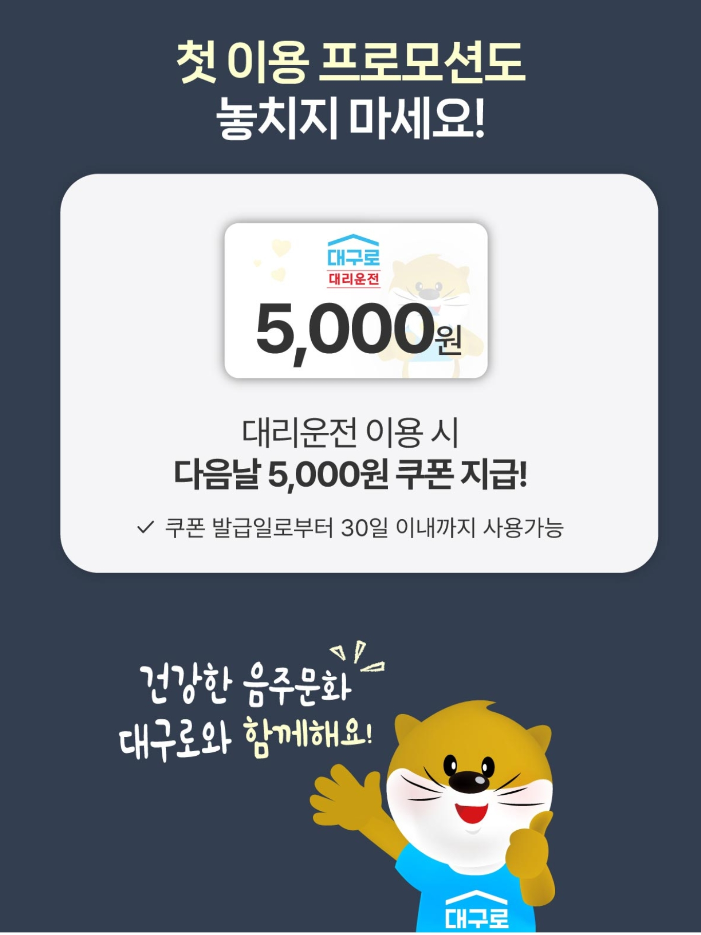 대구로 대리운전 호출 서비스 최초 이용 시 30일 이내 사용가능한 5000원 쿠폰 1매 지급!!