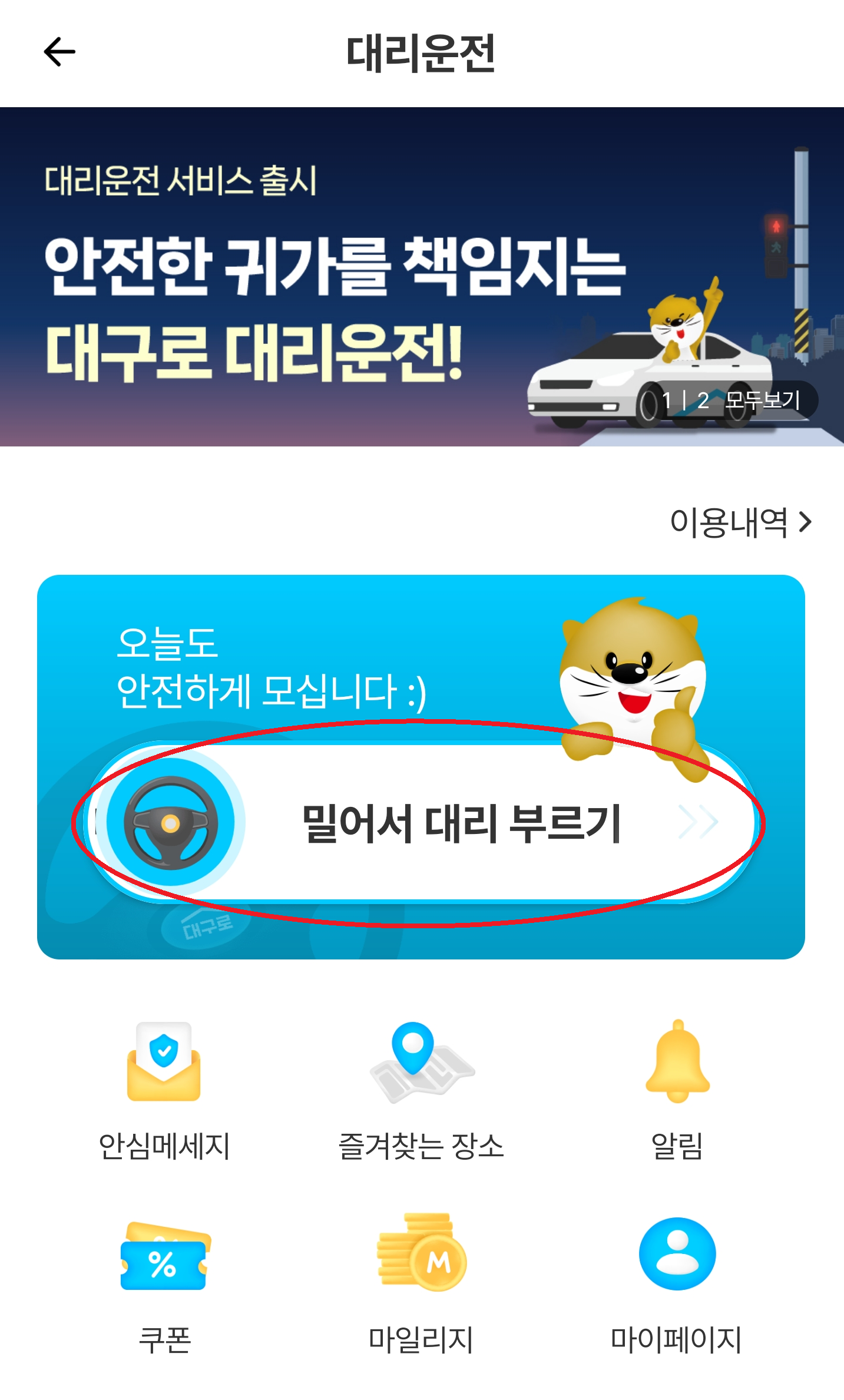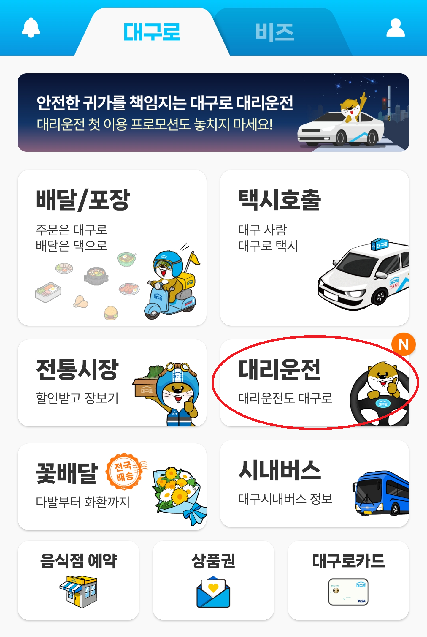 1. 우선 대구로 앱 화면에서 대리운전 항목을 선택.