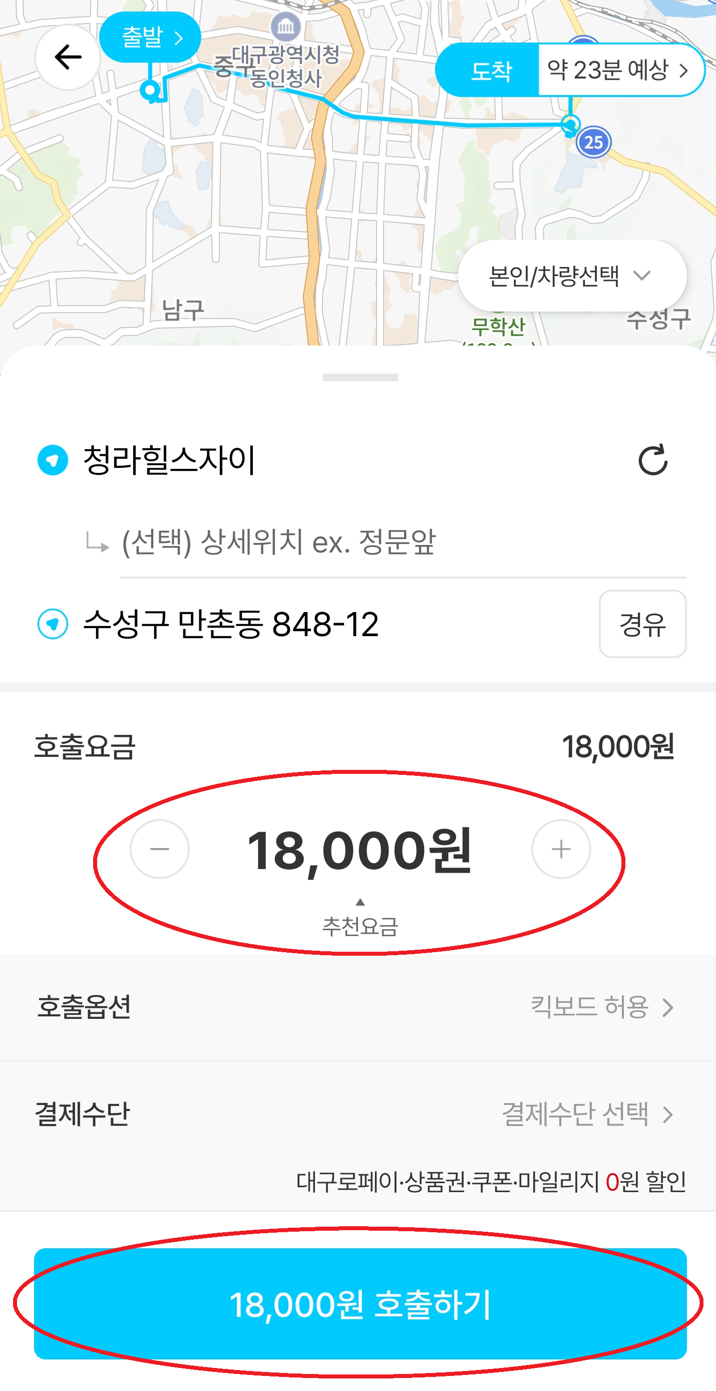 4. 소요 시간 및 호출요금 확인 후 호출하기 항목 누르기.