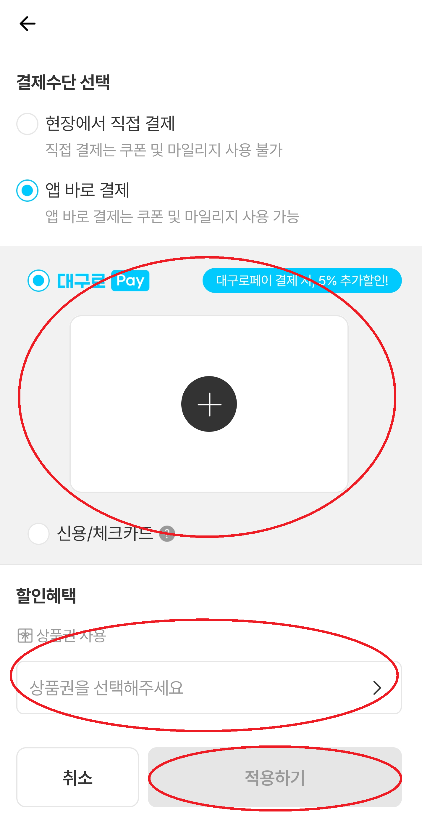 5. 마지막으로 결제수단 및 쿠폰, 상품권 선택 후 적용하기 누르면 호출 완료!