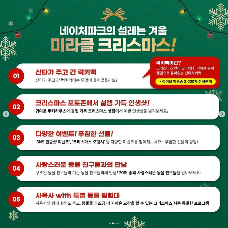 이상으로 23일 네이처파크에서 열리는 <미라클 크리스마스>에 대한 포스팅이었습니다.