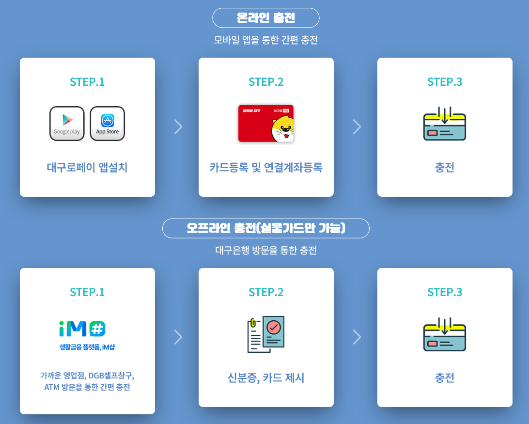 대구로페이는 모바일 앱을 통한 온라인 충전과 대구은행 방문을 통한 오프라인 충전(실물카드만 가능)이 있습니다. 온라인충전의 경우는 모바일 앱에서 카드 등록과 연결게좌 등록을 완료한 후 진행하면 되고, 오프라인 충전의 경우는 실물카드와 신분증을 지참한 후 가까운 대구은행 영업점, 셀프창구, ATM 방문한 후 진행하면 됩니다.