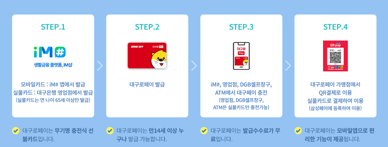다음은 대구로페이 방법에 대해서 알려드리겠습니다. 대구로페이는 모바일카드와 실물카드 2가지 방법으로 발급이 가능합니다. 모바일카드는 iM#어플에서 발급가능하고 실물카드는 대구은행 영업점에서 발급 가능하지만 나이가 65세 이상인 분들만 발급이 가능합니다. 대구로페이는 무기명 충전식 선불카드로 만 14세 이상이면 누구나 발급받을 수 있습니다.