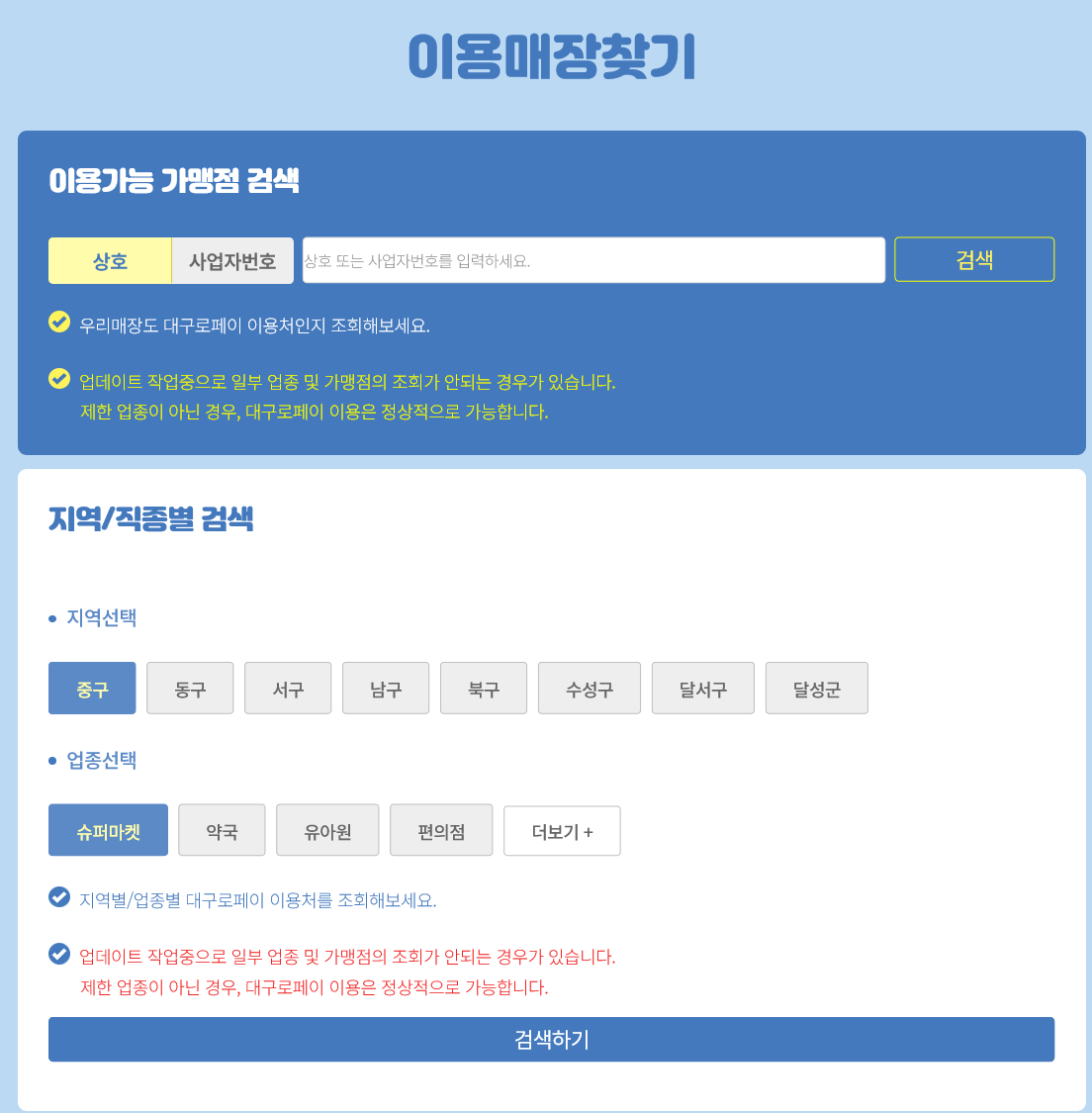 아래의 링크를 통해 들아가신 후 위의 화면을 찾아가셔서 대구로페이 이용이 가능한지 미리 검색해 보시는 것도 좋습니다.