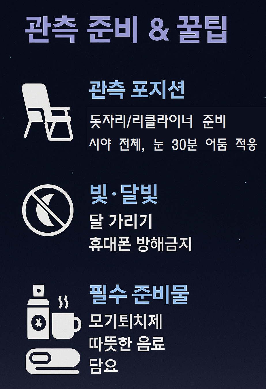 달 위상이 관측 성패를 좌우합니다. 8월 9일 만월(84 % 밝기) 이후
