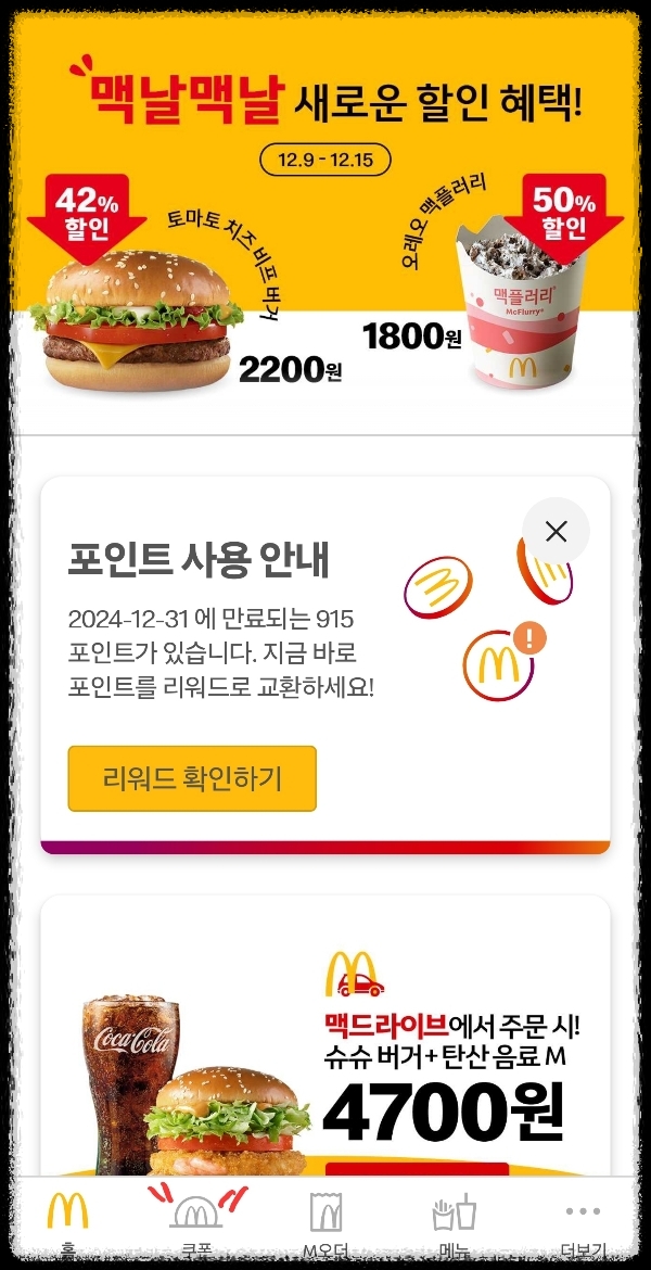 이렇게 쌓인 포인트는 화면 아래 '리워드'로 들어간 후 내가 원하는 제품으로 교환하면 된다.