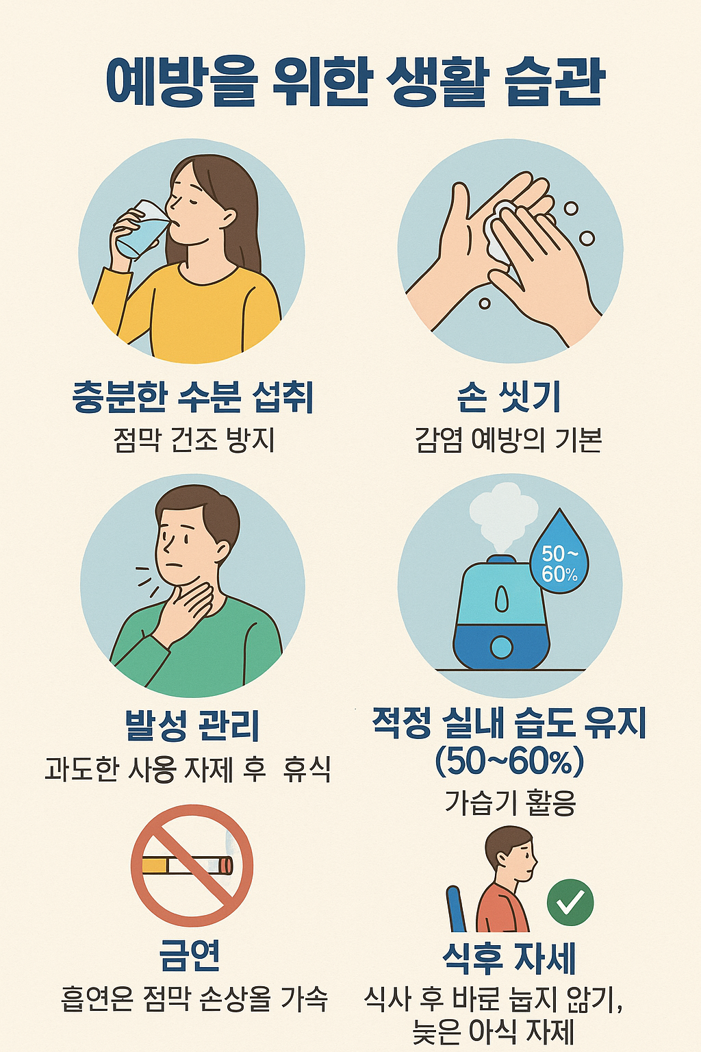 | 발성 과도 | 음성 휴식·가습기 사용, 금연 |