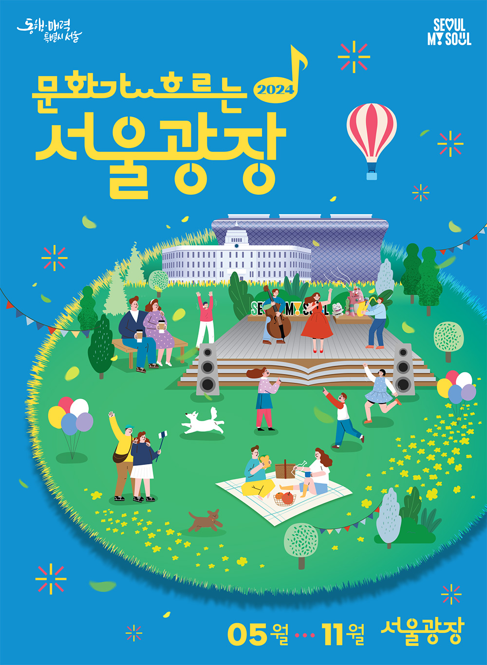 5월 8일부터 시작된 <2024 문화가 흐르는 서울광장>은 시민들의 문화 행사의 기회를 제공하는 축제로서 11월까지 약 7개월 간 서울광장에서 진행될 예정입니다. 뮤지컬, 판소리, 마술, 가요 등 다양한 볼거리를 제공하고 있습니다.