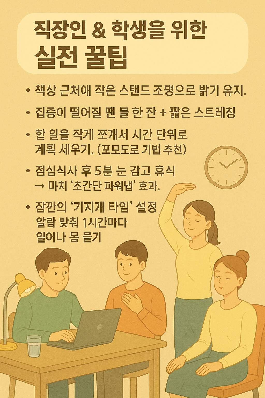 ● 집중이 떨어질 땐 물 한 잔 + 짧은 스트레칭.