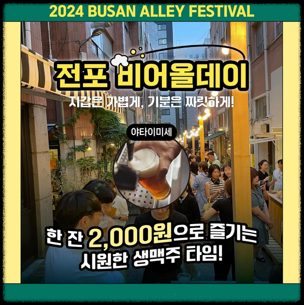 '2024 부산골목 페스티벌'의 "전포공구길" 축제는 '힙한 감성 가득한 골목'이라는 키워드에 맞춰, 숨은 골목의 매력을 재발견하는 축제입니다. "전포비어올데이"에서는 생맥주를 즐기고, '플리마켓과 푸드마켓'에서는 맥주와 어울리는 음식과 함께 잊지 못할 하루를 보내시길 바랍니다.