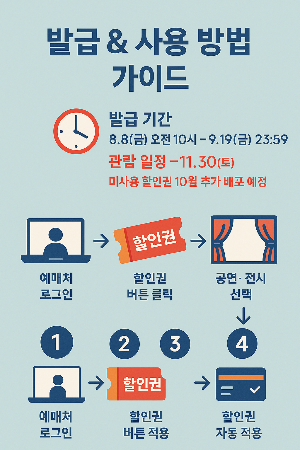 ① 예매처 로그인 → ② 할인권 버튼 클릭 → ③ 원하는 공연·전시 선택 → ④ 결제 시 할인권 자동 적용!
