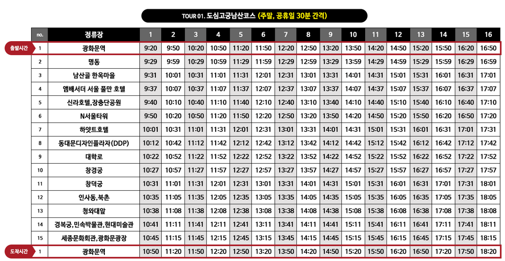 • TOUR1 <도심고궁남산코스> : 도심 고궁남산코스는 N서울타워, 명동, 남산골 한옥마을, 창덕궁, 인사동, 청와대, 경복궁등 서울의 주요 관광지를 순환하는 코스입니다. 원하는 정류장에서 하차하여 자유롭게 관람 후 다음 버스를 이용할 수 있습니다. 버스 간격은 평일 40분 주말 30분으로 되어있습니다.