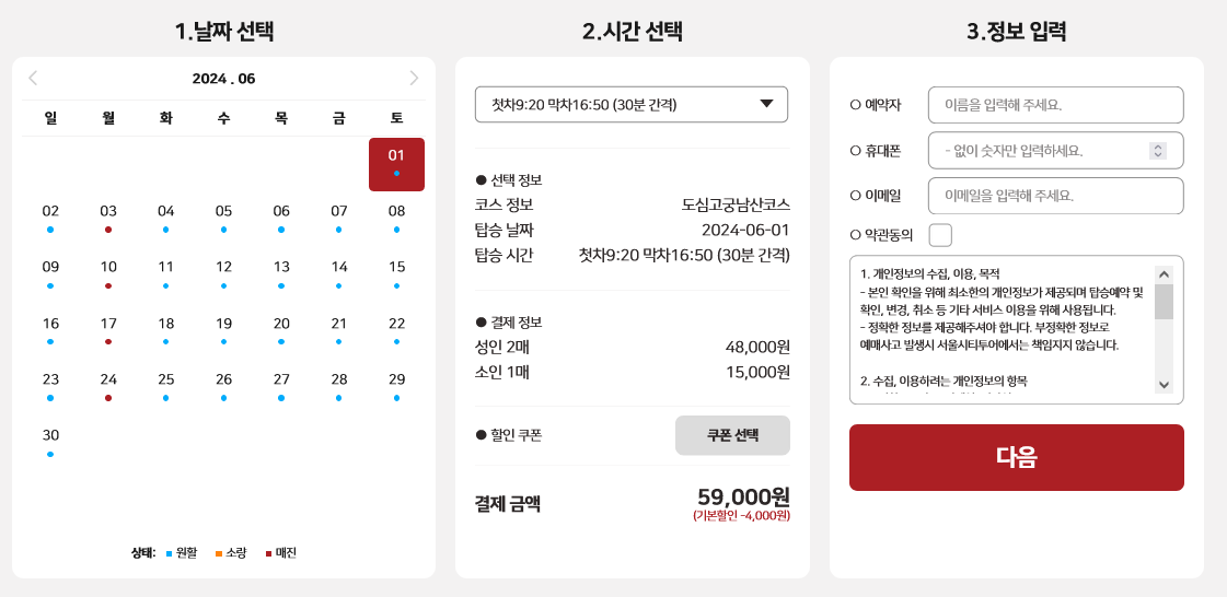 위의 링크를 통해 가시면 아래에 화면처럼 예약 신청할 수 화면이 나옵니다. 우선 내가 투어 하고 싶은 코스와 아래에 인원을 선택하고 다음 화면에서 날짜 선택, 시간선택, 정보입력등을 완료하신 후 신용카드, 가상계좌, 계좌이체 중의 방법으로 결제를 하시면 됩니다.