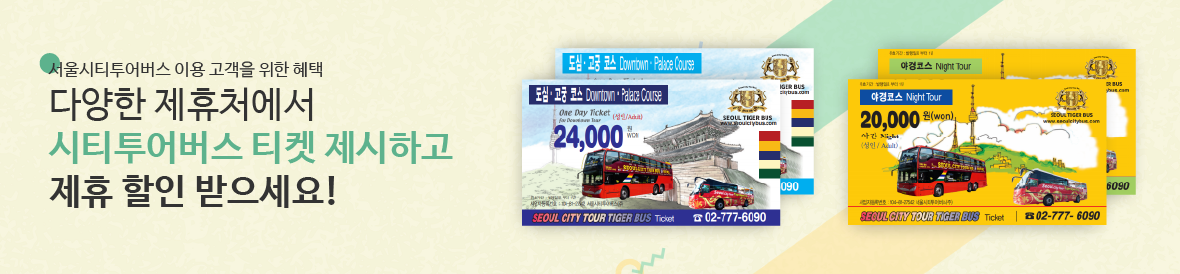 서울시티투어버스를 이용하는 분들은 당일 티켓을 지참하시면 제휴를 맺은 식당, 카페, 공연 및 전시, 쇼핑등에서 할인 혜택을 받으실 수 있습니다. 아래 링크에서 제휴 업체 확인하시고 식당, 카페등 미리 동선을 짜보시는 것도 좋은 방법일 듯합니다.