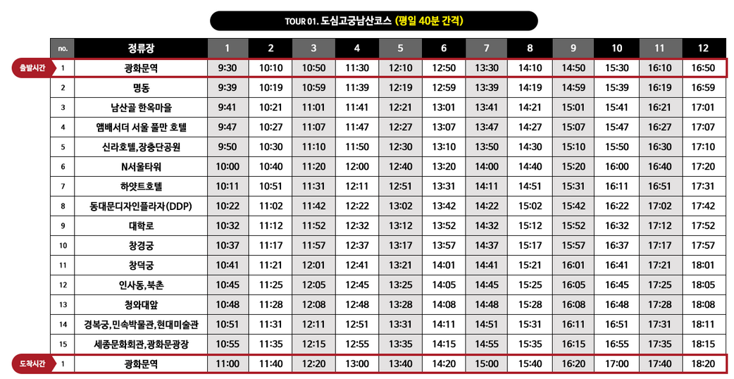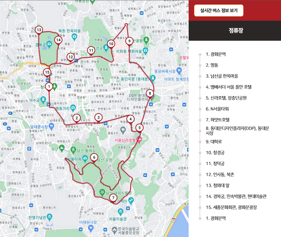 - TOUR1 <도심고궁남산코스> : 도심 고궁남산코스는 N서울타워, 명동, 남산골 한옥마을, 창덕궁, 인사동, 청와대, 경복궁등 서울의 주요 관광지를 순환하는 코스입니다. 원하는 정류장에서 하차하여 자유롭게 관람 후 다음 버스를 이용할 수 있습니다. 버스 간격은 평일 40분 주말 30분으로 되어있습니다.