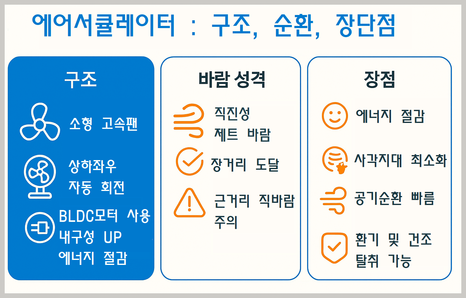 바람의 형태·도달거리·순환효율이 달라 사용 목적과 공간에 따라 체감 성능이 크게 달라집니다.