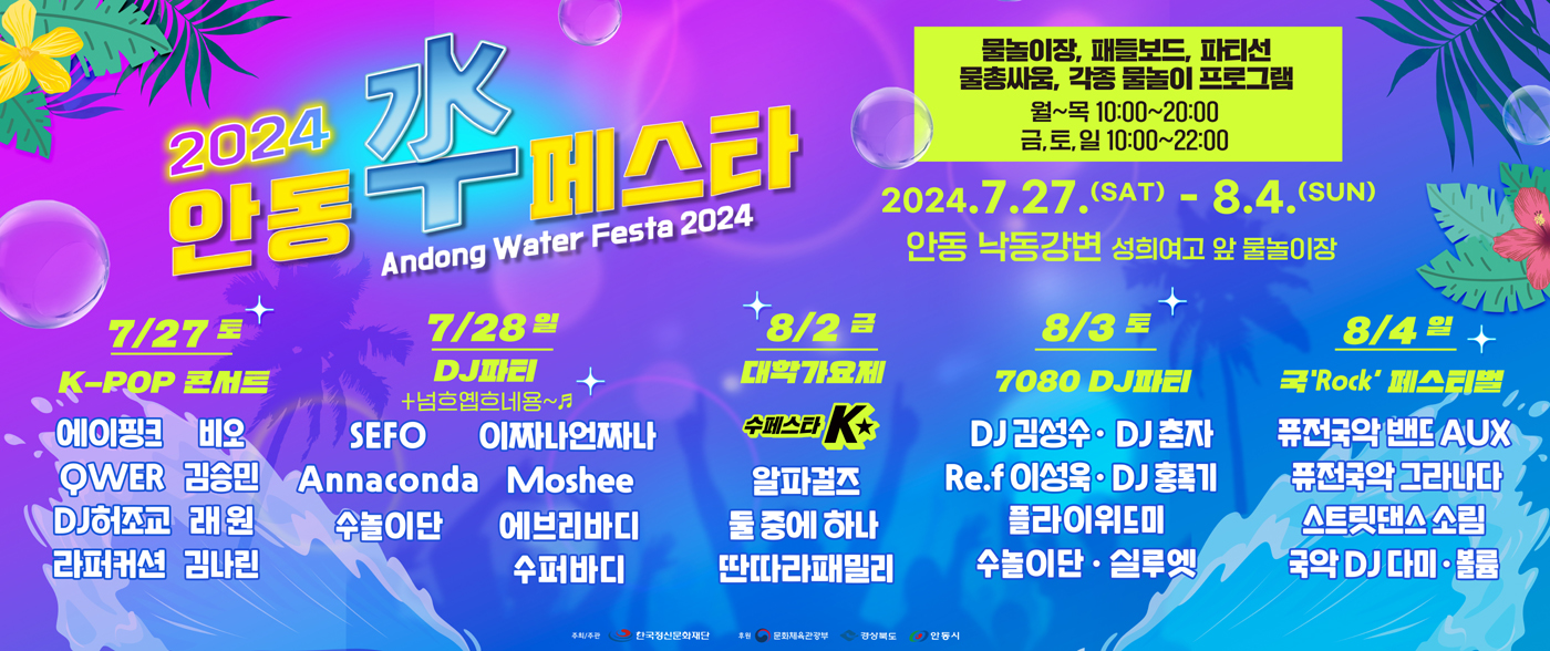 2024안동수(水)페스타, 안동여름축제, 수페스타, 리버사이드바캉스, 체험프로그램, EDM파티, 썸머바이브, 캠핑/피크닉, 플리마켓