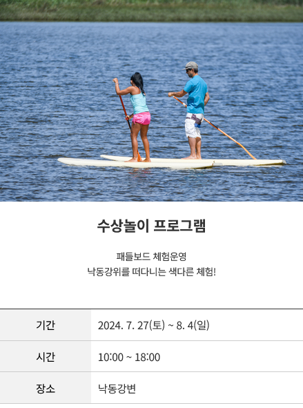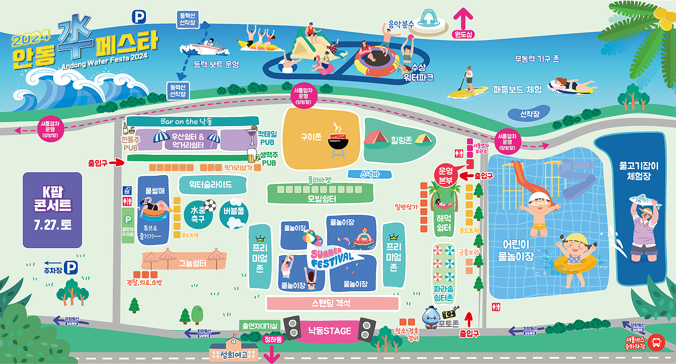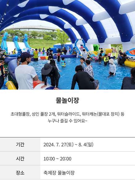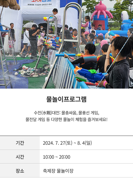 - 축제 내용 : 물놀이 프로그램, 공연프로그램, 부대행사