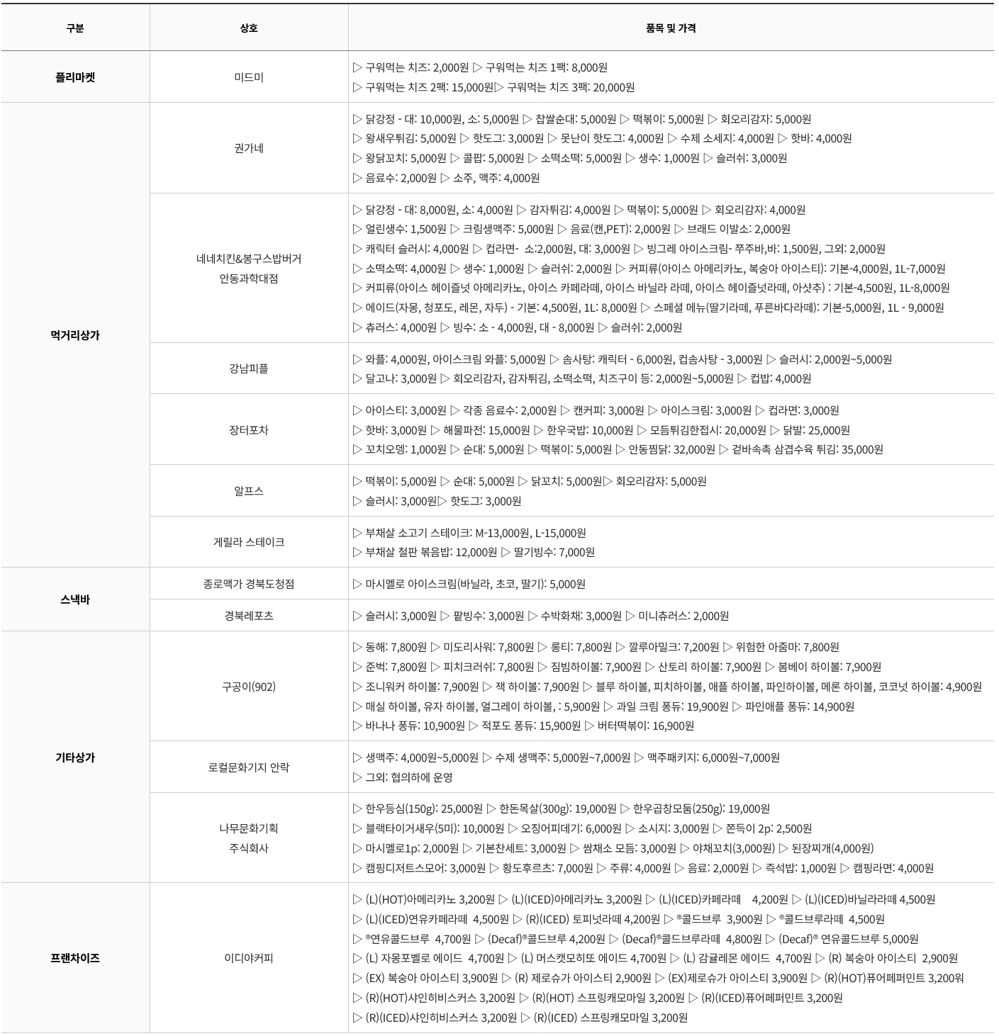 ● 축제장 먹거리 종류 및 가격