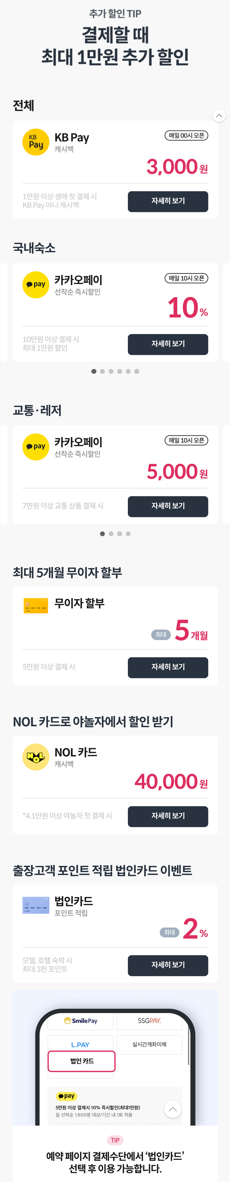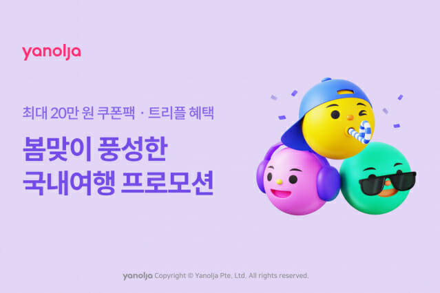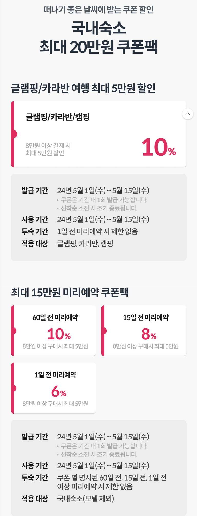 먼저 야놀자에서는 5월 15일까지 글램핑, 카라반, 캠핑 전용 최대 5만 원 할인 쿠폰과 미리 예약 시 사용가능한 최대 10%(국내숙소 전용, 5만 원 한도) 할인 쿠폰 3종을 선착순 발급(최대 20만 원 할인)한다고 합니다. 그리고 매주 대표 호텔 및 펜션을 엄선해 트리플혜택을 제공하고 7% 추가 할인 쿠폰을 선착순지급, 제휴카드 및 간편 결제 서비스까지 이용하면 1만 원 중복할인까지 가능합니다.