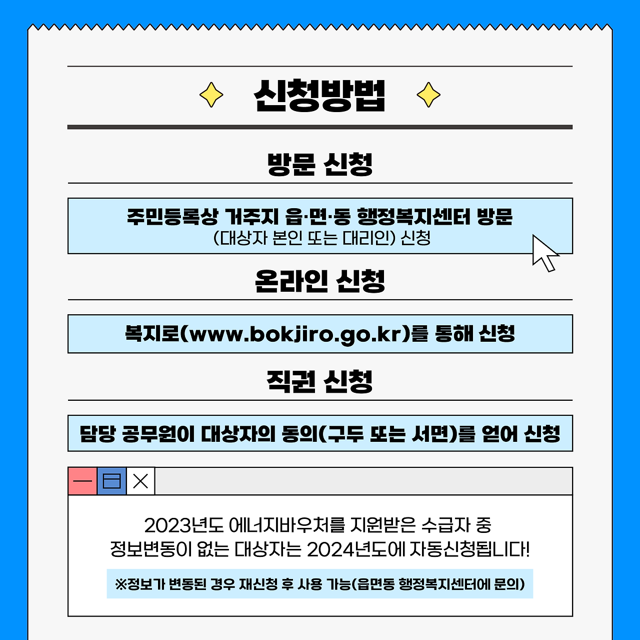 - 작년에 에너지 바우처 지원을 받으신 분들은 자동으로 신청이 된다고 합니다.(정보가 변경된 경우 행정복지센터에 문의 후 재신청)