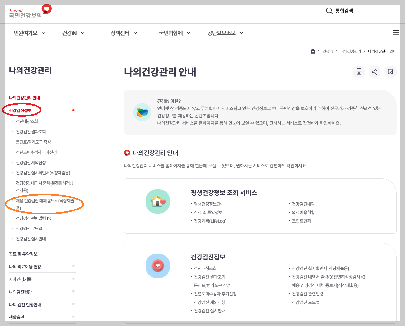 국민건강보험공단 누리집 채용 건강검진 대체 통보서 발급 받으러 가기