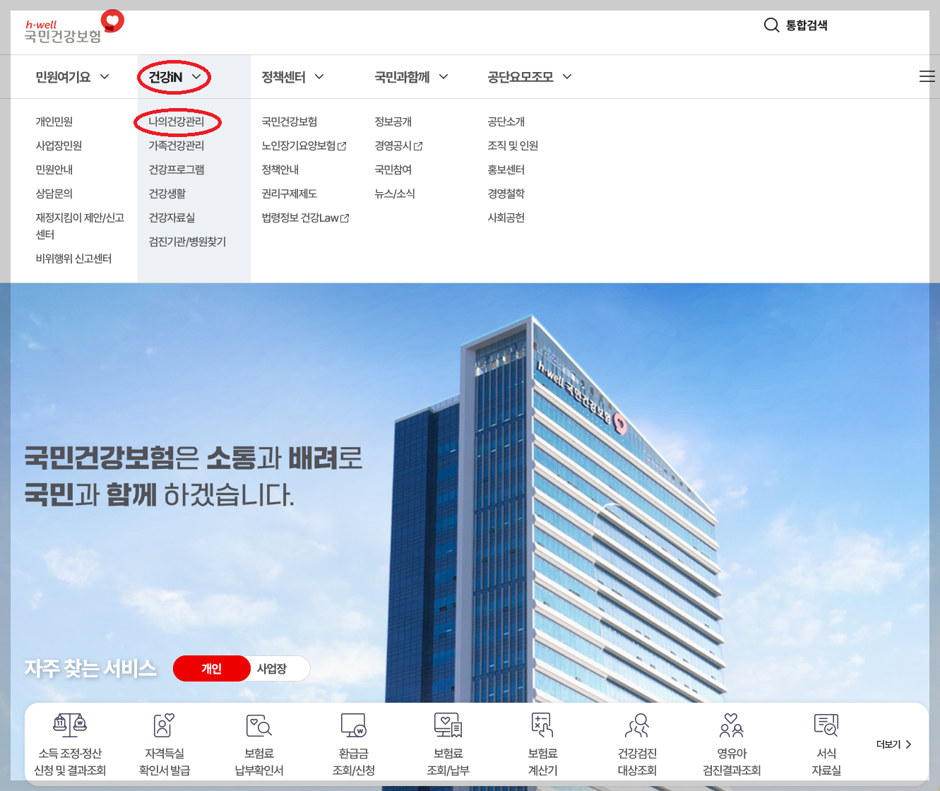 채용 건강검진 대체 통보서 발급을 위해서는 우선 국민건강보험 회원가입 및 로그인을 하셔야 합니다. 인증서 로그인 후 홈화면 상단 '건강 iN' 탭에서 '나의 건강관리'를 클릭하시면 됩니다.