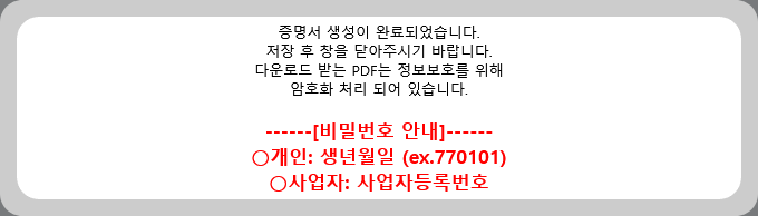 ※ 파일 다운로드 시 확인을 위해서는 개인은 주민등록번호, 사업자는 사업자번호로 암호가 걸려 있으니 참고하시기 바랍니다.