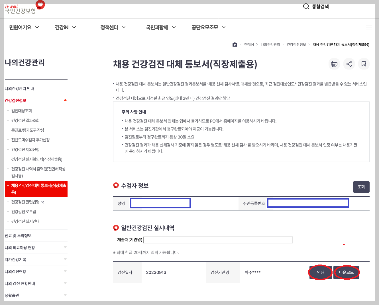마지막으로 수검자 정보에서 조회를 클릭, 본인의 성명 주민등록번호 확인 후 제출처(기관명) 입력한 뒤 인쇄 혹은 다운로드를 하시면 됩니다.