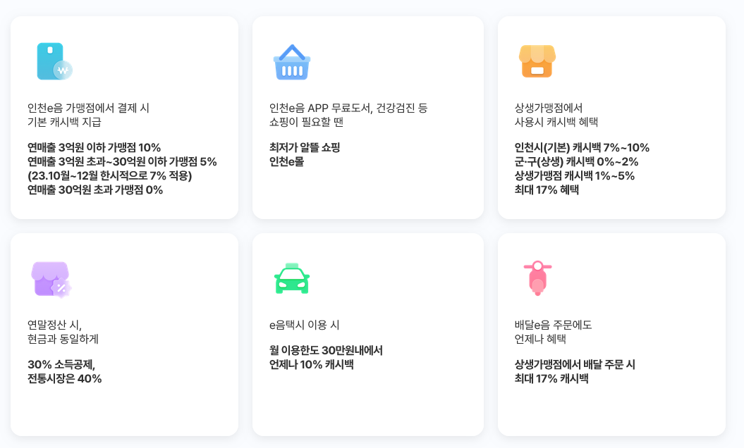 인천 전역 어디서든 사용 즉시 최대 10% 캐시백이 가능하고(백화점, 대형마트, 기업형 슈퍼마켓, 택시 등 일부 제외) 연말정산 시 30%, 전통시장 40% 소득공제도 가능합니다. 별도의 상생가맹점에서는 최대 17%까지 캐시백이 된다고 합니다.