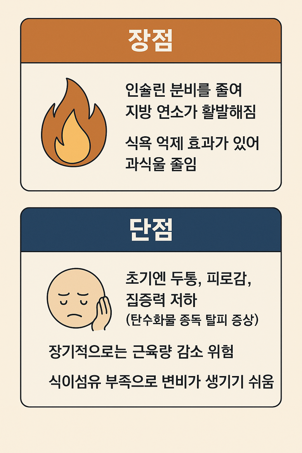 - 초기엔 두통, 피로감, 집중력 저하(탄수화물 중독 탈피 증상)