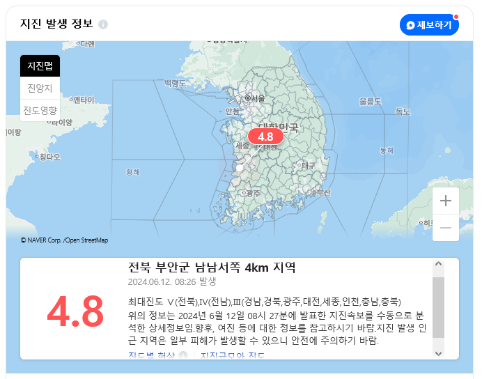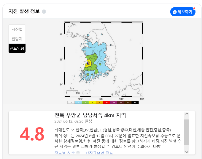 6월 12일 08시 26분 전북 부안군 남남서쪽 4KM지역 진도 4.8 지진 발생 낙하물, 여진주의 부탁드립니다.