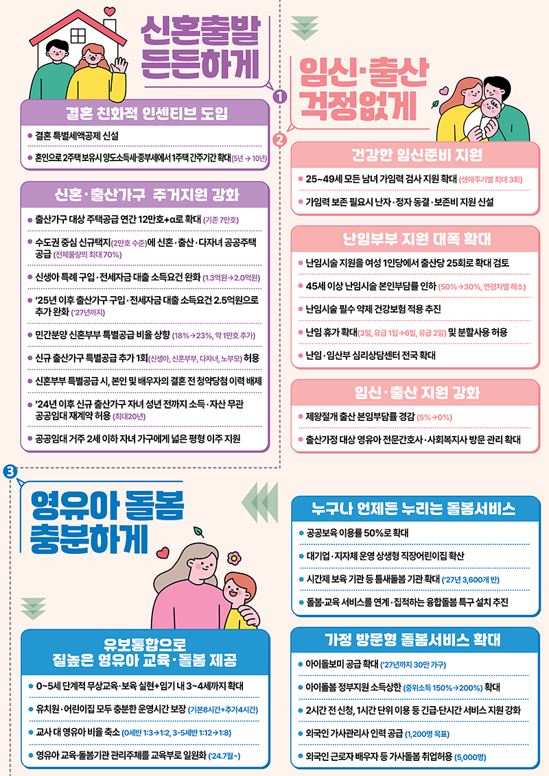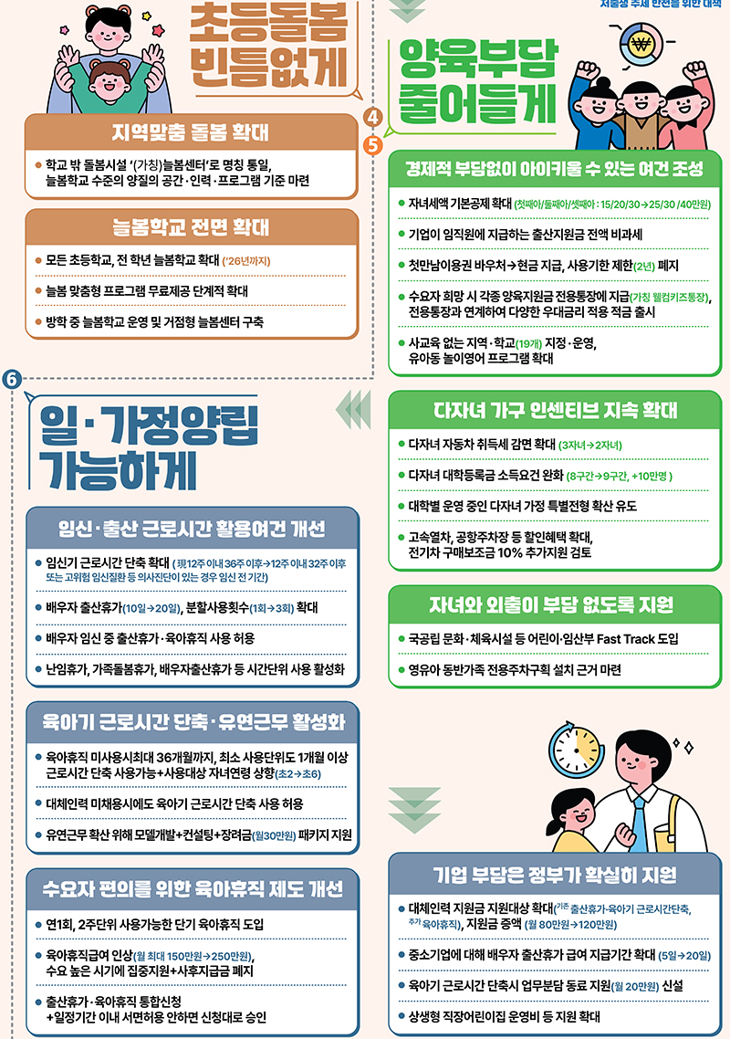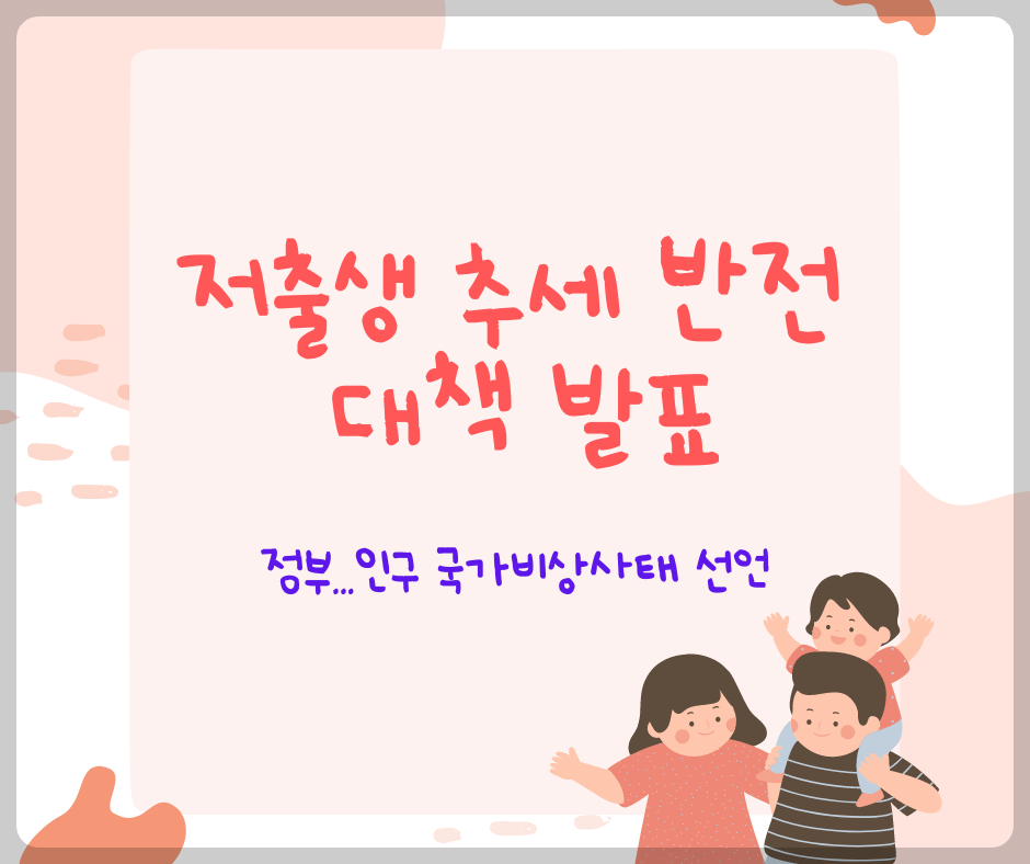 빠른 속도로 진행되고 있는 저출생 추세를 극복하기 위해 저출산고령사회위원회는 '저출생 추세 반전을 위한 대책'을 발표하고 일/가정 양립 지원을 강화하고 교육, 돌봄, 주거 부담을 획기적으로 줄이기 위해 범정부적으로 대응에 나서기로 했습니다.