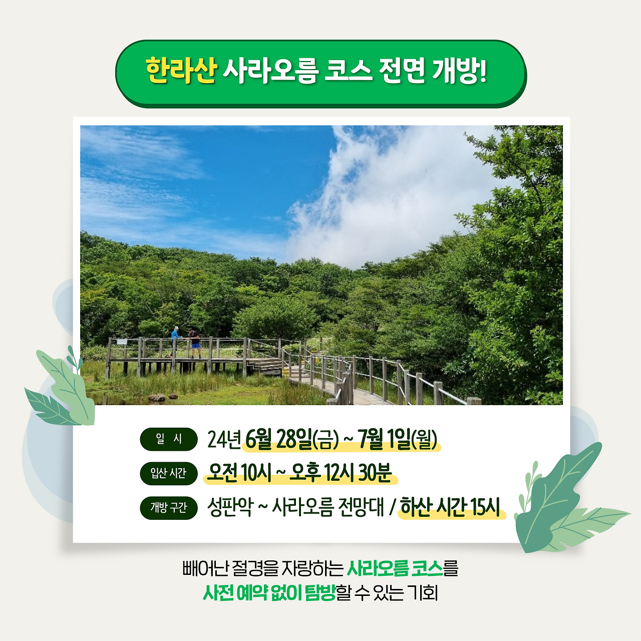 한라산 사라오름 정상을 사전 예약 없이 오전 10시 이후 자연환경 해설사와 함께 탐방할 수 있는 행사도 병행합니다.