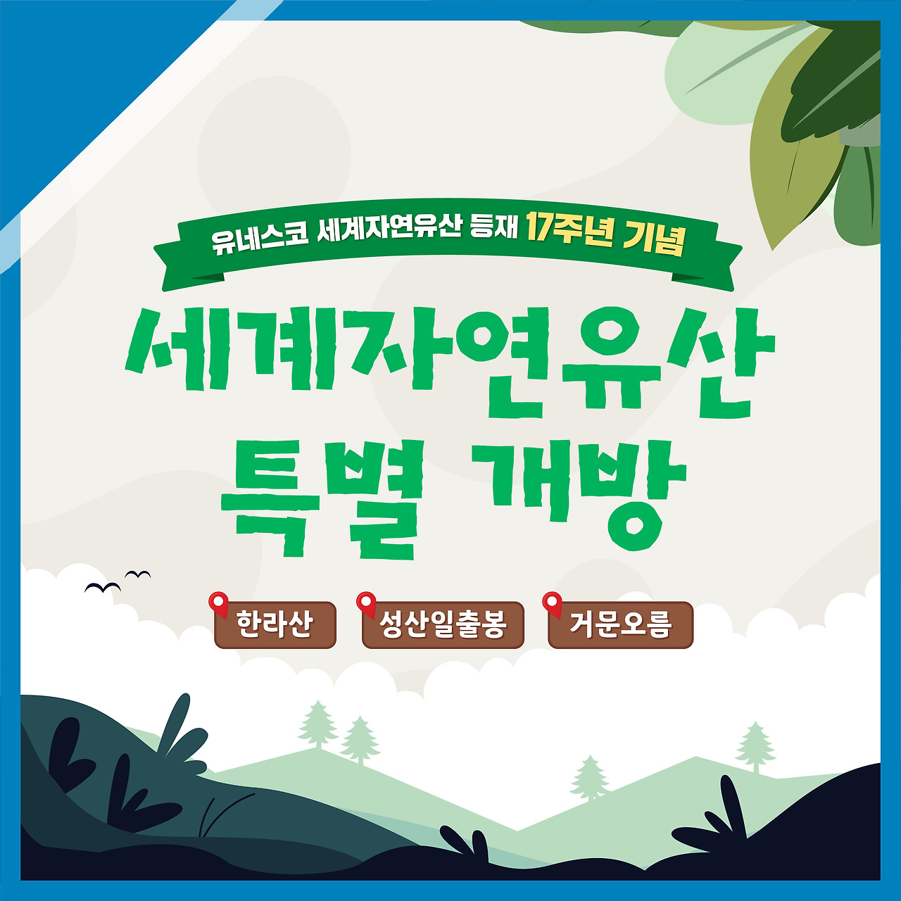 제주도 세계유산 본부에서 세계자연유산 등재 17주년을 기념해 거문오름 용암길, 성산일출봉, 한라산 사라오름 정상 3곳을 특별 개방하여 무료 탐방 등 다양한 행사를 개최할 예정입니다.
