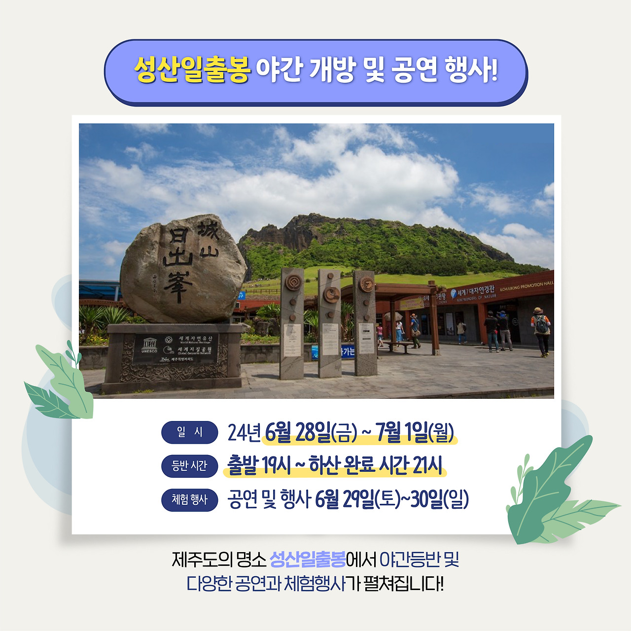 특별 개방기간에 처음으로 진행되는 성산일출봉 야간 탐방은 저녁 6시 50분부터 21시(하산완료시간)까지 성산 일출봉 정상을 무료로 즐길 수 있고, 6월 29일과 30일에는 성산일출봉 잔디광장에서 공연과 체험 행사도 개최합니다.
