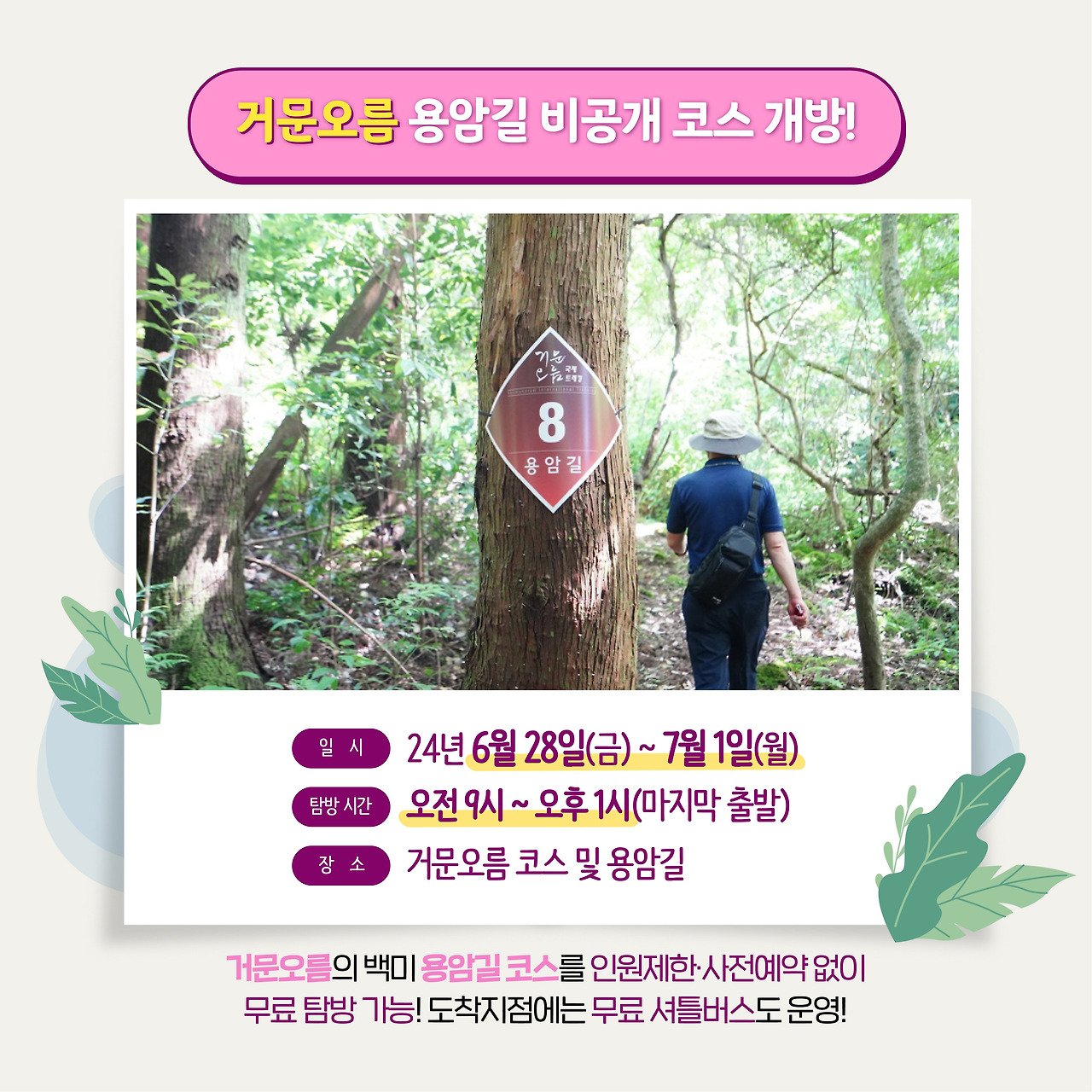 6월 28일부터 7월 1일까지 특별 개방기간으로, 평소에 개방하지 않는 거문오름 용암길(6KM 구간)을 사전 예약 없이 무료로 탐방할 수 있습니다. 편의를 위해 용암길 종점~세계자연유산센터가지 20분 간경의 셔틀버스도 운행합니다.