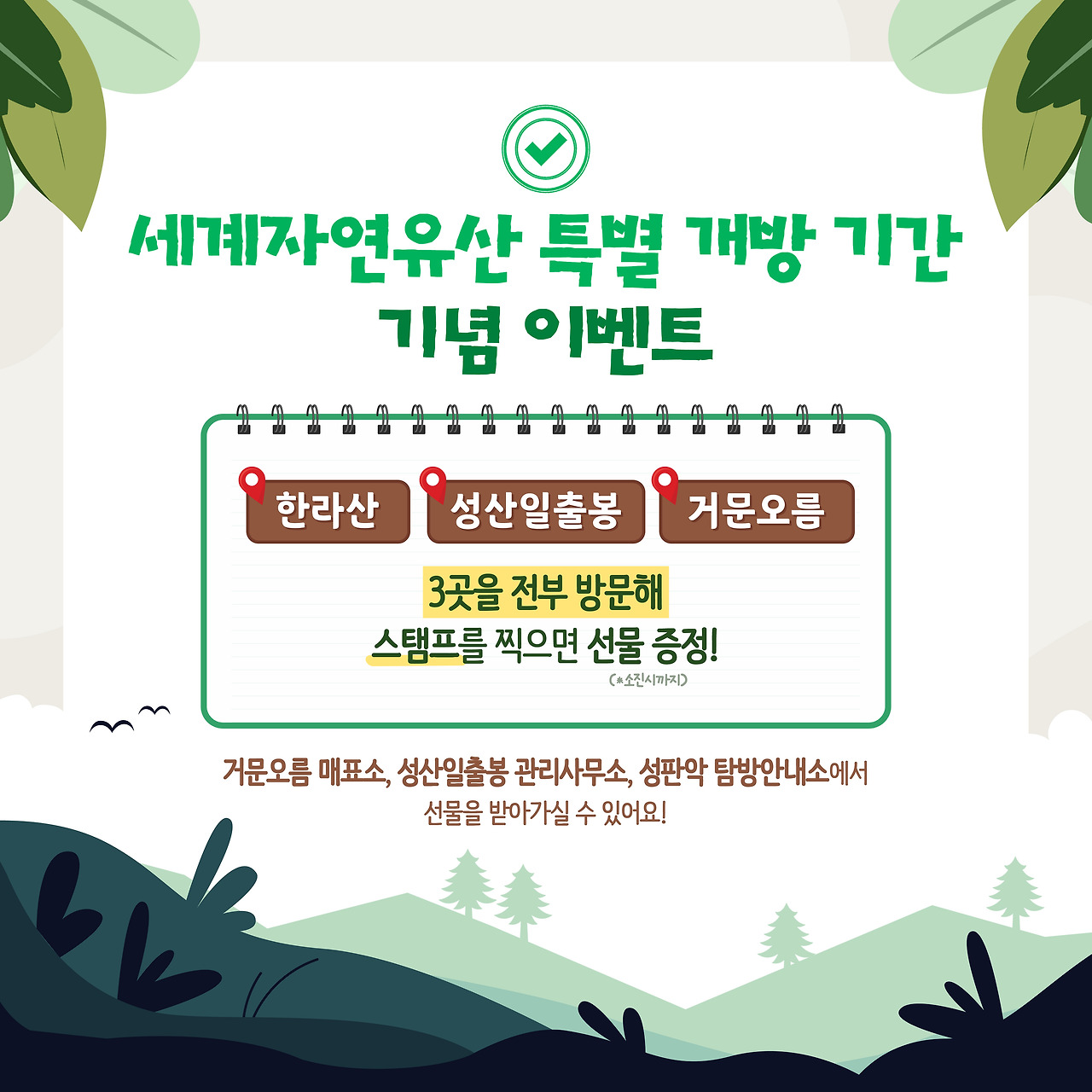 이 기간 동안 거문오름(매표소), 성산일출봉(관리사무소), 한라산(성판악 탐방안내소) 3곳을 방문해 스탬프를 찍으면 소정의 선물을 증정하는 이벤트도 진행합니다.