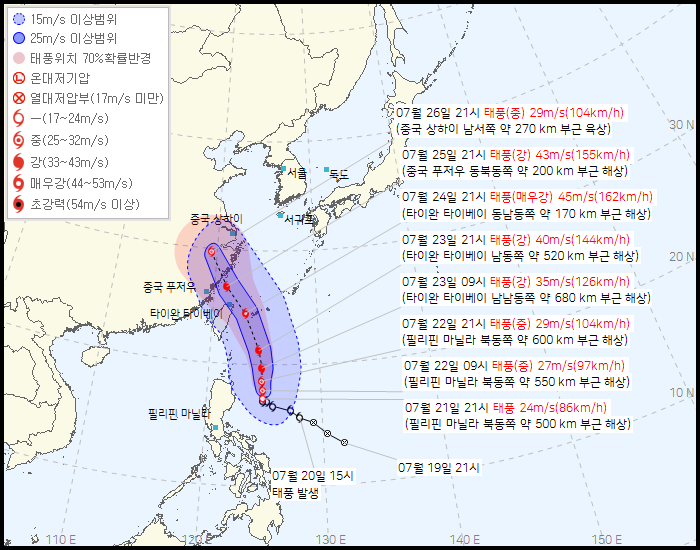 현재 예상 경로라면 우리나라에 직접 영향을 주진 않겠지만, 북진하며 북쪽에 놓인 북태평양고기압 강도를 강화하고 북쪽으로 확장하게 만들 예정입니다. 이 영향으로 인해 북한 쪽에 대기상층으로 기압골이 지나면서 비구름대가 다시 활성화해 경기 서해안을 중심으로 중부지방에 22일 새벽부터 비가 내릴 예정입니다.