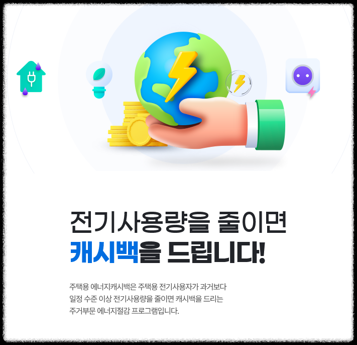 주택용 전기사용자가 과거보다 일정 수준 이상 전기사용량을 줄이면 캐시백을 드리는 주거부문 에너지절감 프로그램입니다.